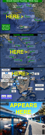Or you may Select one of the other Tabs in Frame 3 to see more panos and other Multi-Media as well as search for Hotels and Ferries. So the main action happens in Frames 3 & 4, which fit on one screen on a mobile/tablet but you will need to scroll on a laptop. The main change in this new style is that whatever you select appears in the Frame(s) BELOW, rather than being taken to "places from whence you might not find your way back". SLIDE SHOW On the other hand you may have a "thing" for beach umbrellas or Greek Ruins so there is a large green Tag for each Island Group in Frame 2 that invites you to view a Panorama Slide Show